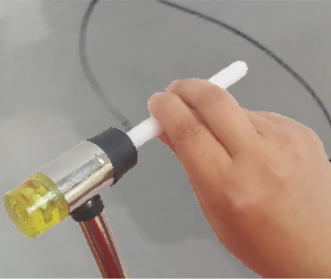 Using clean cloth, clean dent area with the release agent. Then apply heated glue from glue gun to the center of the glue. Select one of the puller tab according to the dent to be treated and stick it to the glue.